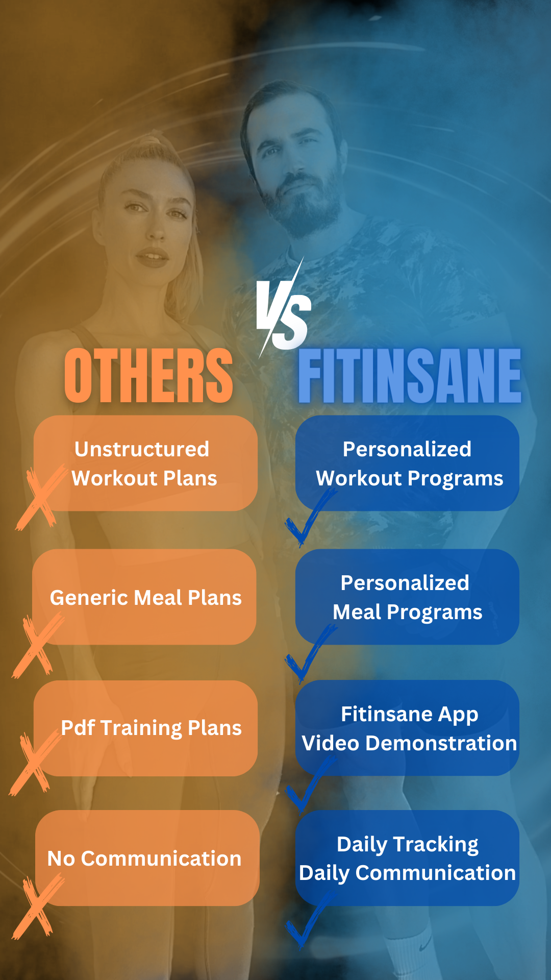 Everything you need is always with you. You can follow your training and nutrition plans via FITINSANE APP with advanced features. You can get full support from their professional coaches, Imge and Dogukan Gursoy. With FITINSANE APP, your progress is under control every day.